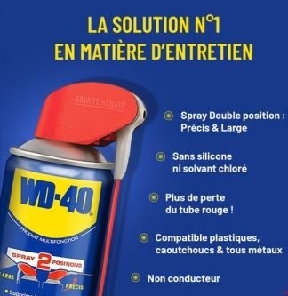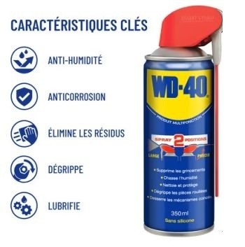 Le WD-40 350 ML est un spray multifonction offrant cinq actions essentielles (lubrifie, protège, dégrippe, chasse l'humidité et élimine les résidus), avec un système de pulvérisation double position et une valve à 360°, idéal pour l'entretien de vos outils et équipements métalliques et plastiques à la maison comme au travail.