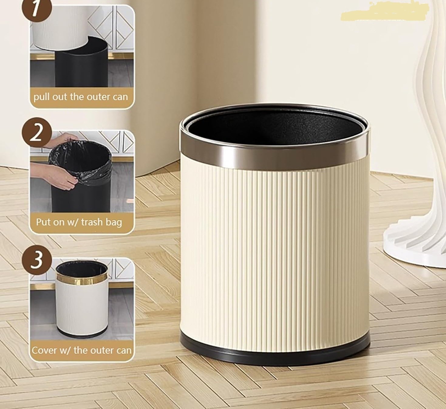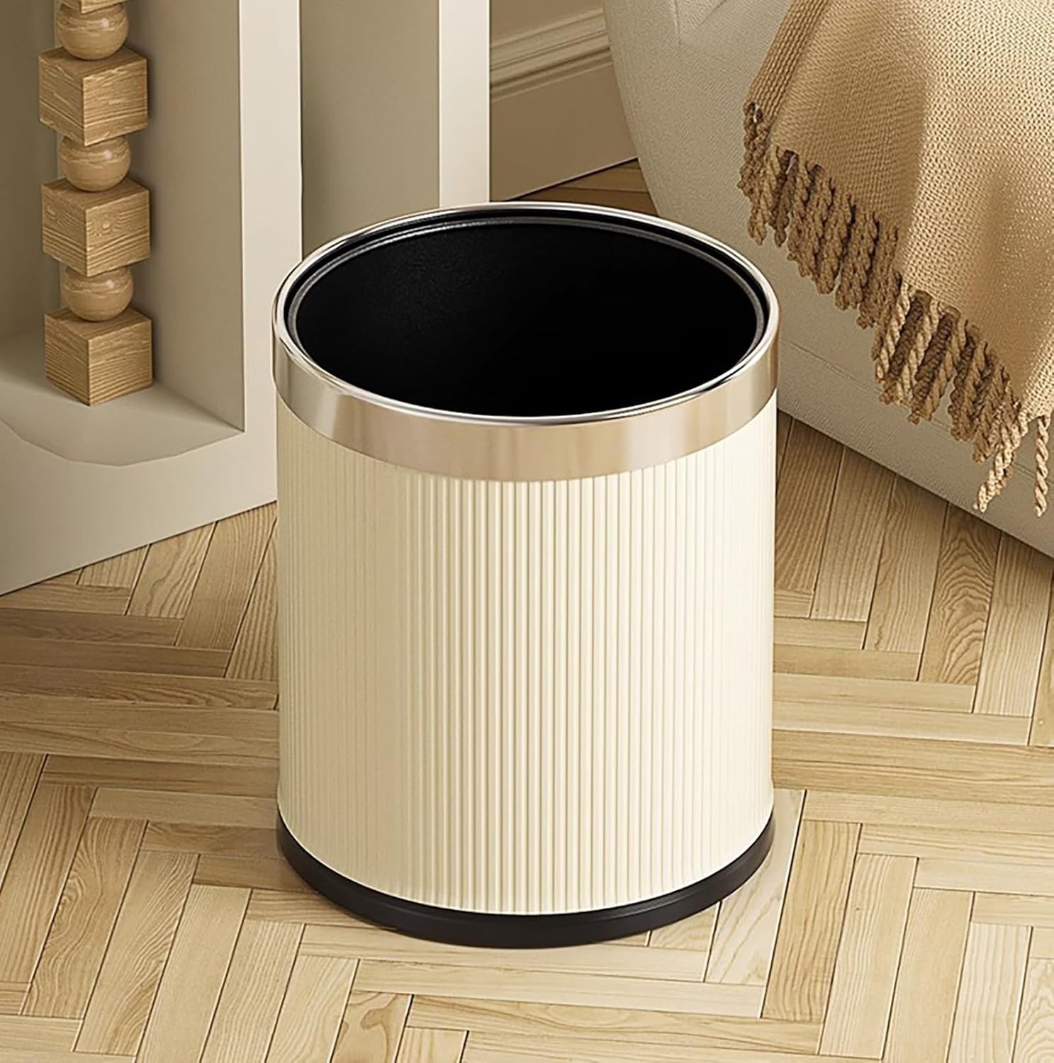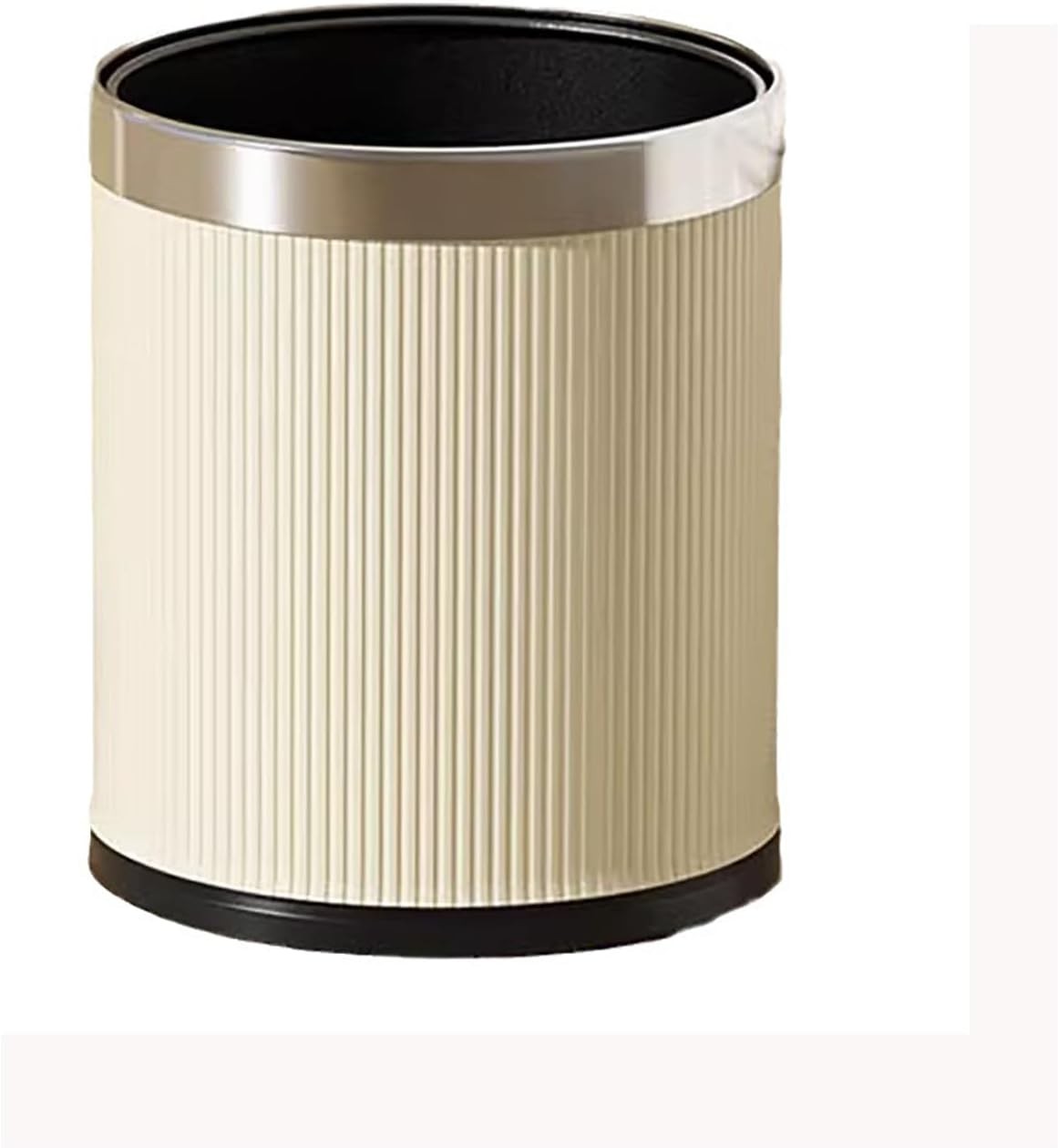 Poubelle moderne au design élégant avec corps strié et finition supérieure en chrome.