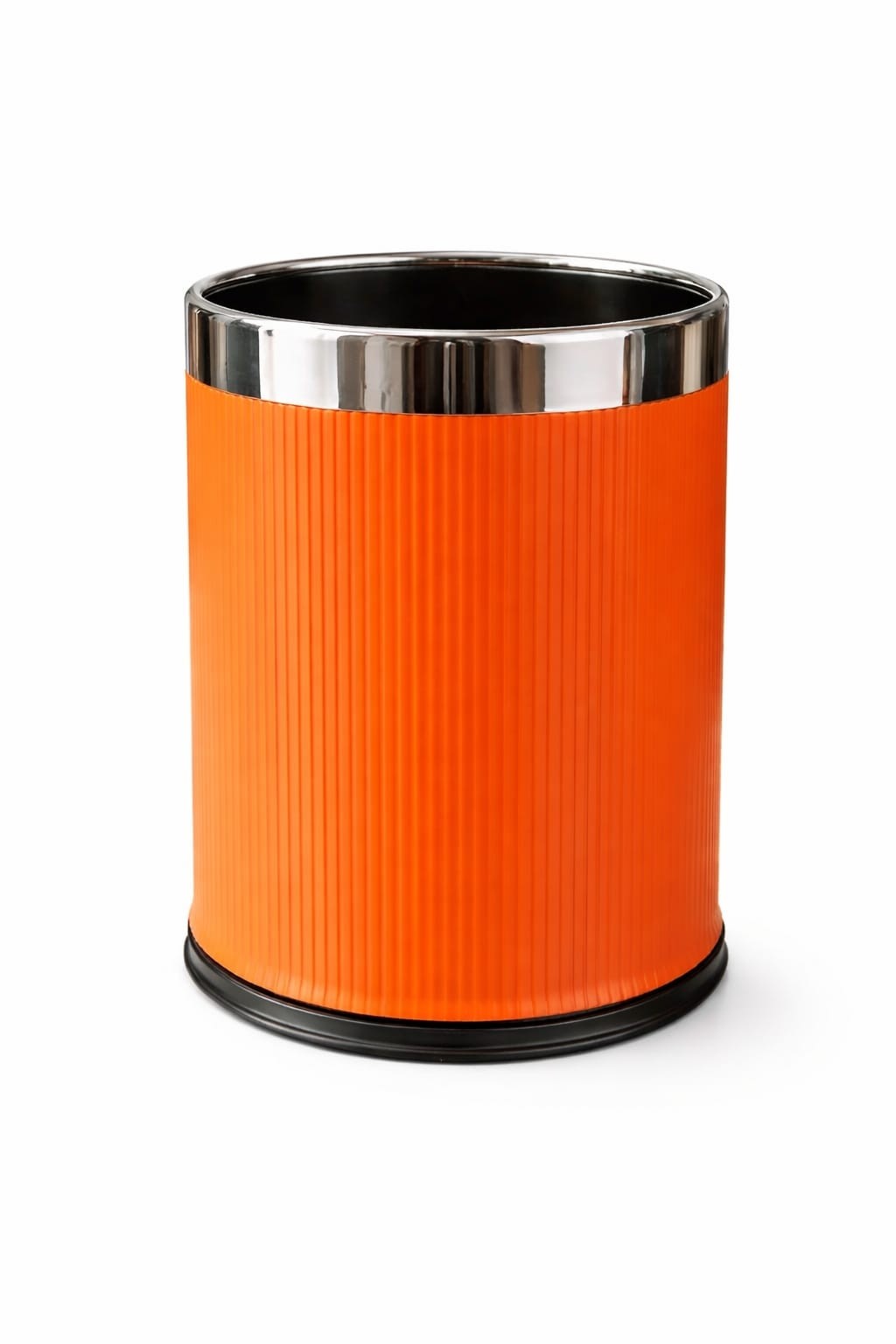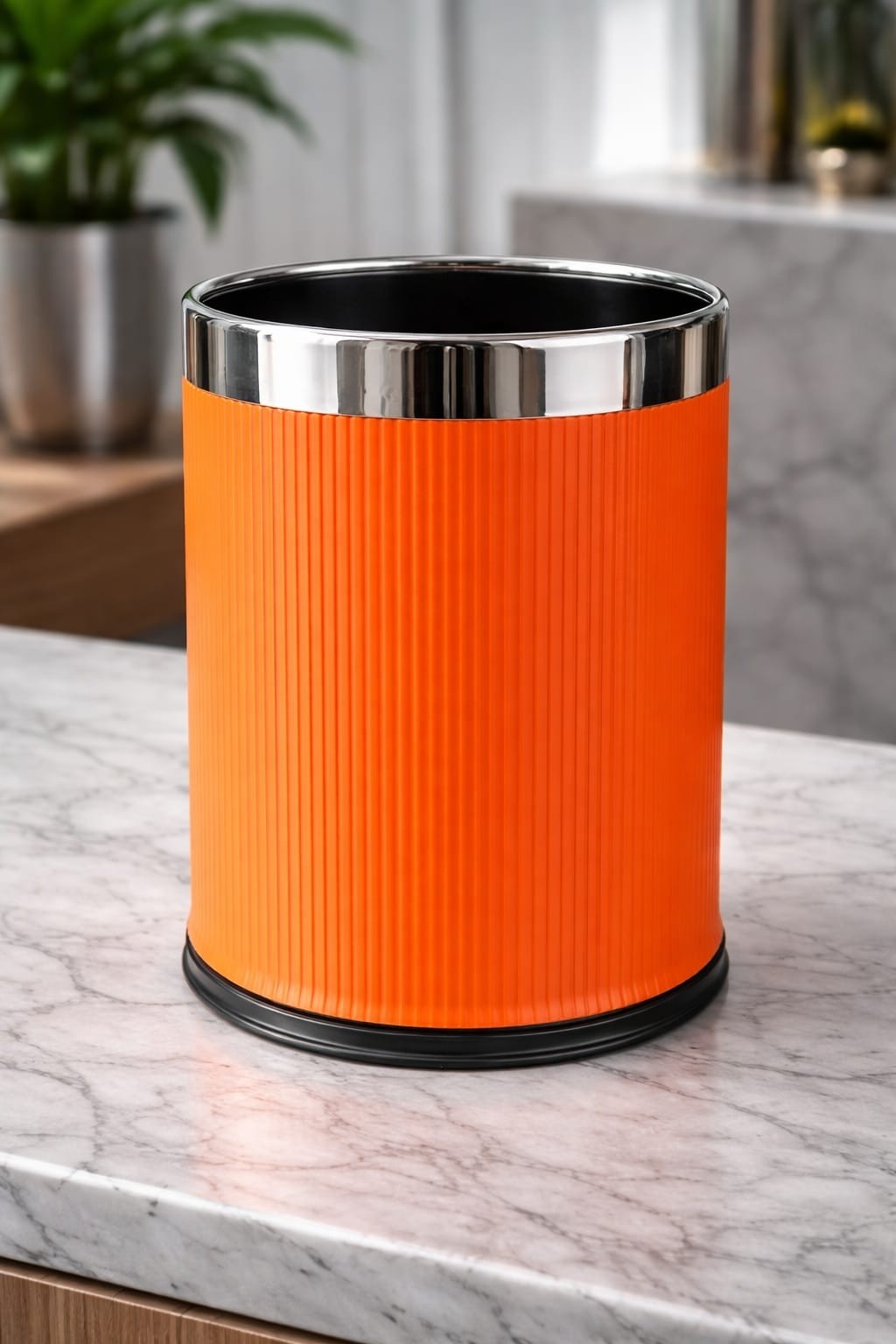 Poubelle moderne au design élégant avec corps strié et finition supérieure en chrome.